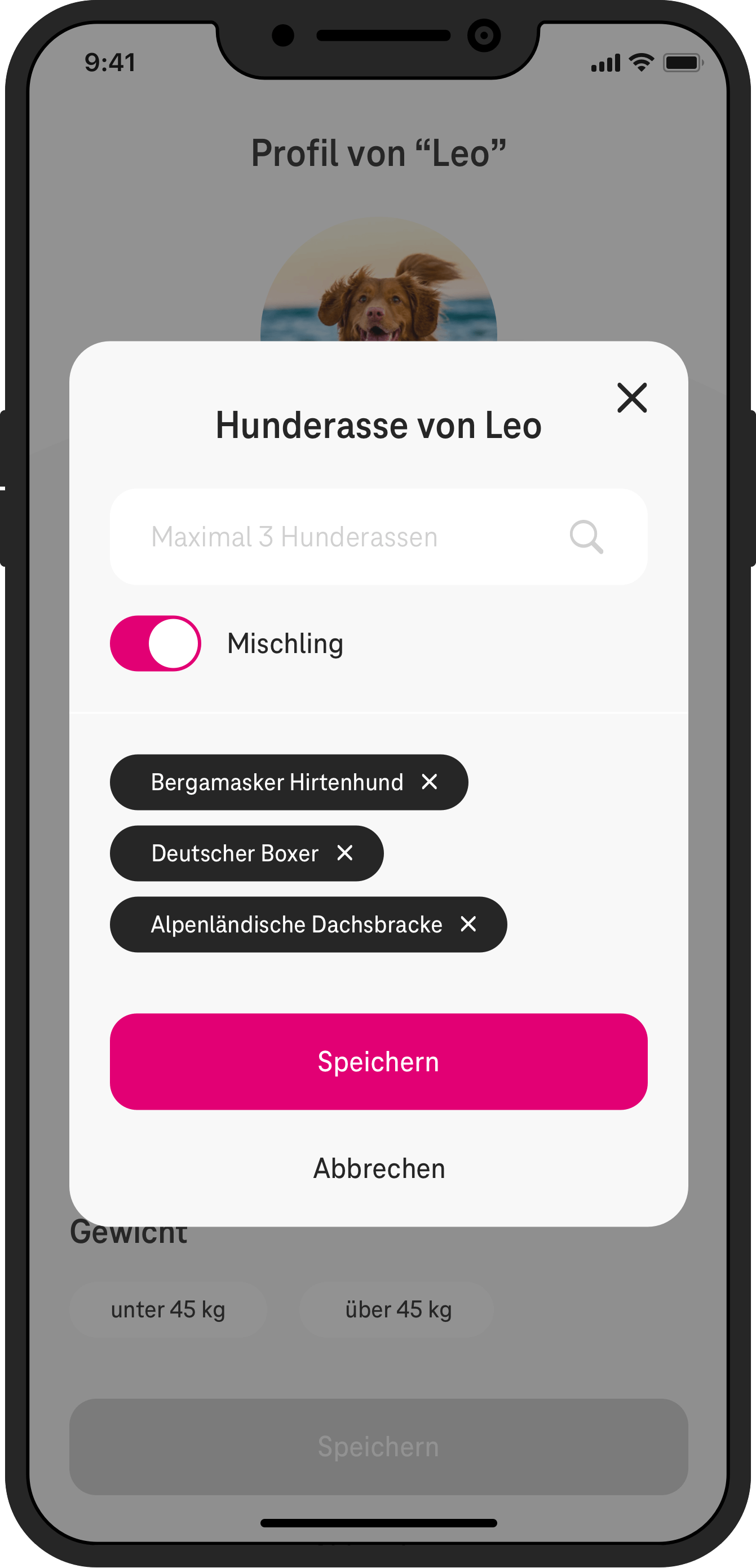 Im Usertest wurden den Probanden verschiedene Aufgaben erstellt, um herauszufinden, ob diese die Logik des Modals verstehen würden. Da bei den Teilnehmern keine grundlegenden Schwierigkeiten auftraten und den meisten das Konzept schlüssig schien, mussten in diesem Fall keine Änderungen vorgenommen werden. Lediglich der Text im Disabled Input war für einen User schwierig zu erkennen („Maximal 3 Hunderassen“), hier war man jedoch an den Styleguide des Kunden gebunden.