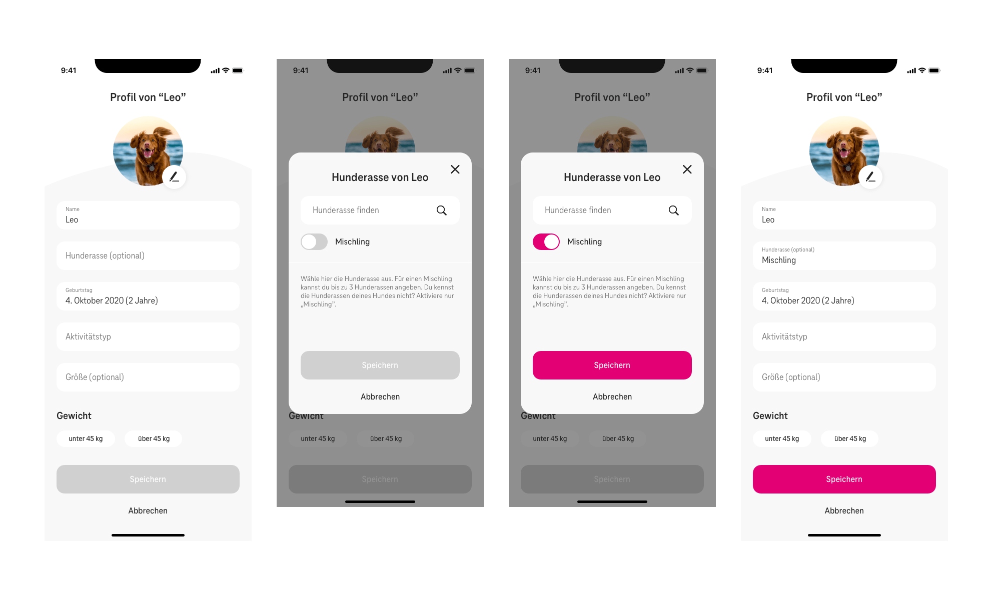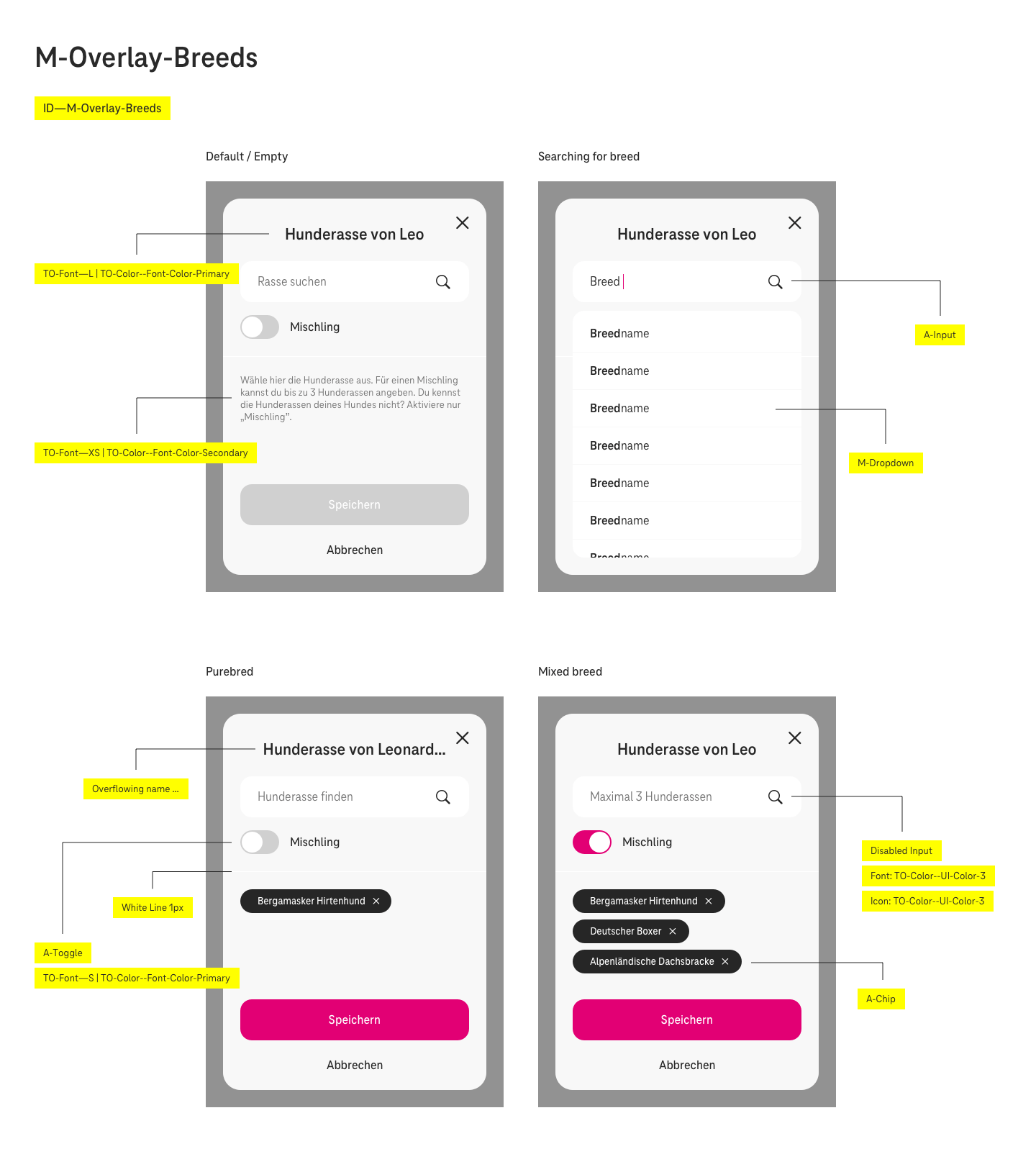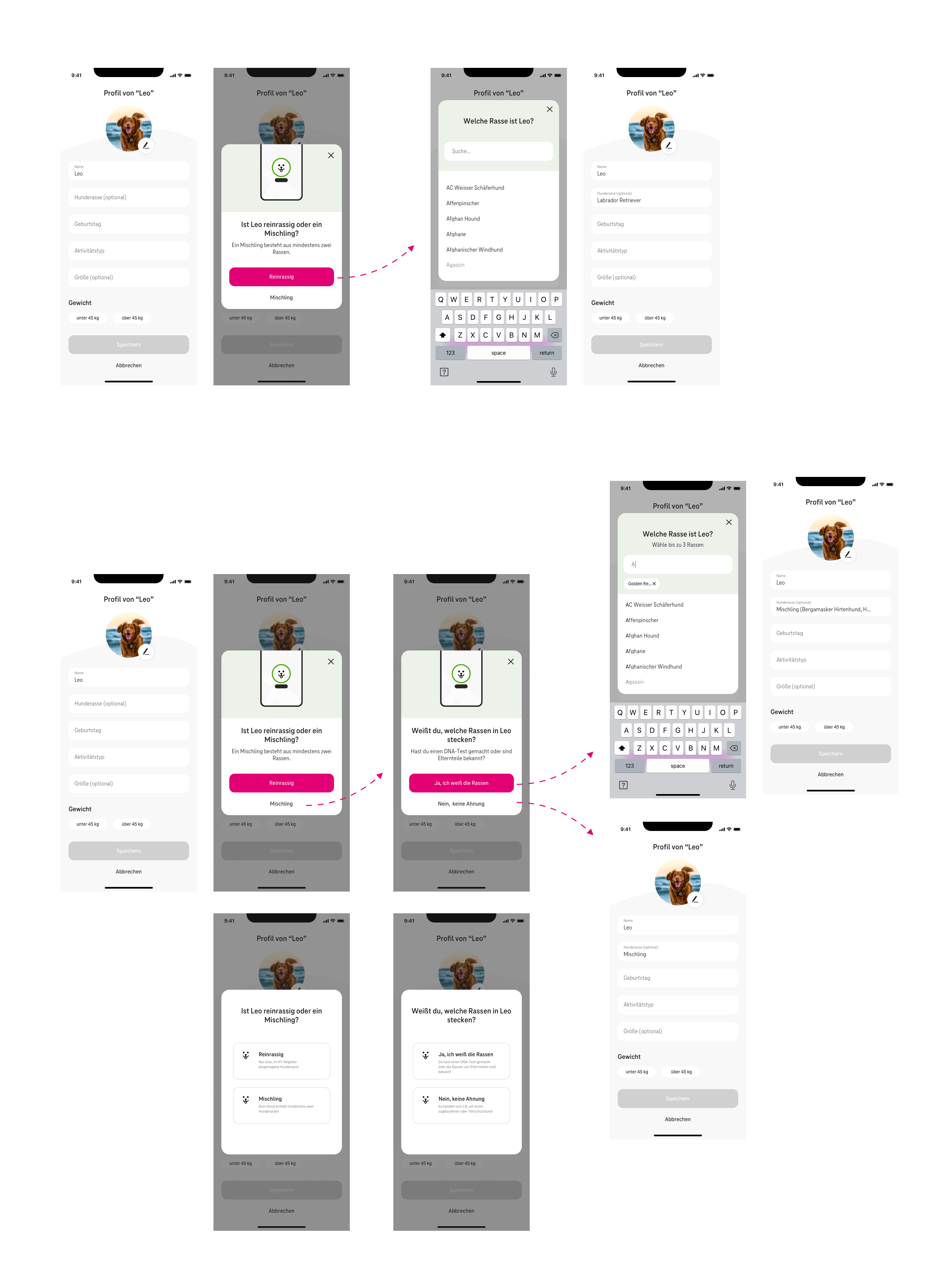 Das Testen der verschiedenen Lösungsansätze führte schließlich zu der finalen Ausarbeitung des feingeschliffenen User Interfaces, das nach und nach UX-technisch noch weiter verfeinert wurde. Die Lösung besteht final aus einem Modal, das im Wesentlichen aus einem Autosuggest Suchfeld, einem Mischling Toggle und einem Platz für die Hunderassen Chips besteht, das im empty state mit einem Hinweistext versehen ist. Im angehängten Screenshot sieht man die 3 Userflows für reinrassige- und Mischlingshunde mit bekannten oder unbekannten Rassen. Die Option Fields wurden verworfen, da diese suggerieren könnten, dass keine Mehrfachauswahl möglich sein könnte. Dafür wurde in den Listenergebnissen der Suchbegriff fett hervorgehoben. Eingetragene Hunderassen werden im Hintergrund gespeichert, damit bei unabsichtlichem Aktivieren oder Deaktivieren des Mischlings Toggle die Auswahl nicht verloren geht. Da die Vorgabe des Kunden war, dass man bei einem Mischling nur maximal 3 Hunderassen angeben kann, wird das Suchfeld ab dieser Anzahl deaktiviert und mit dem Hinweis „Maximal 3 Hunderassen“ versehen. Es wurden außerdem noch 2 Screens für kleinere Phones angefertigt, um das Verhalten bei zu wenig Platz zu demonstrieren.