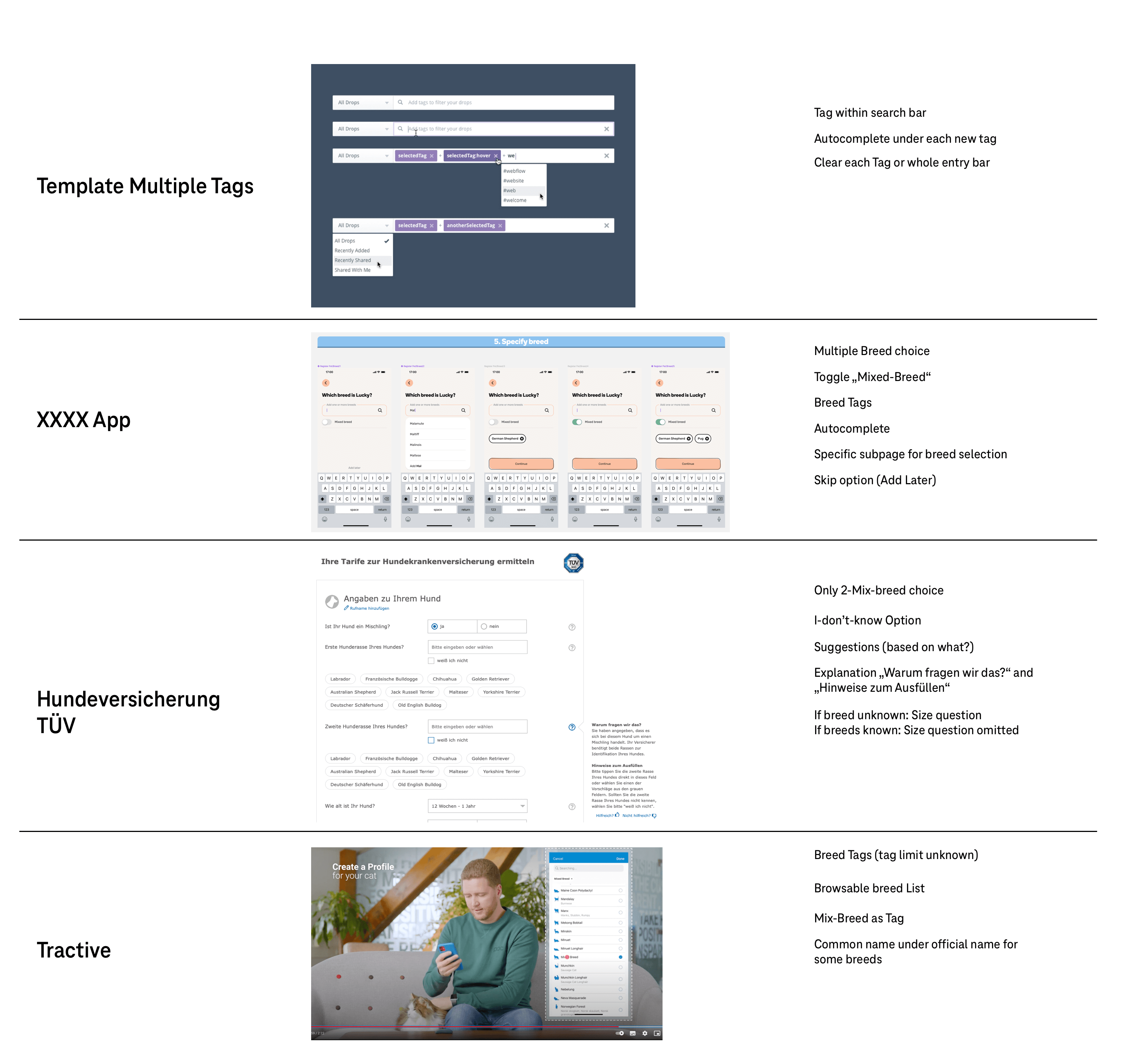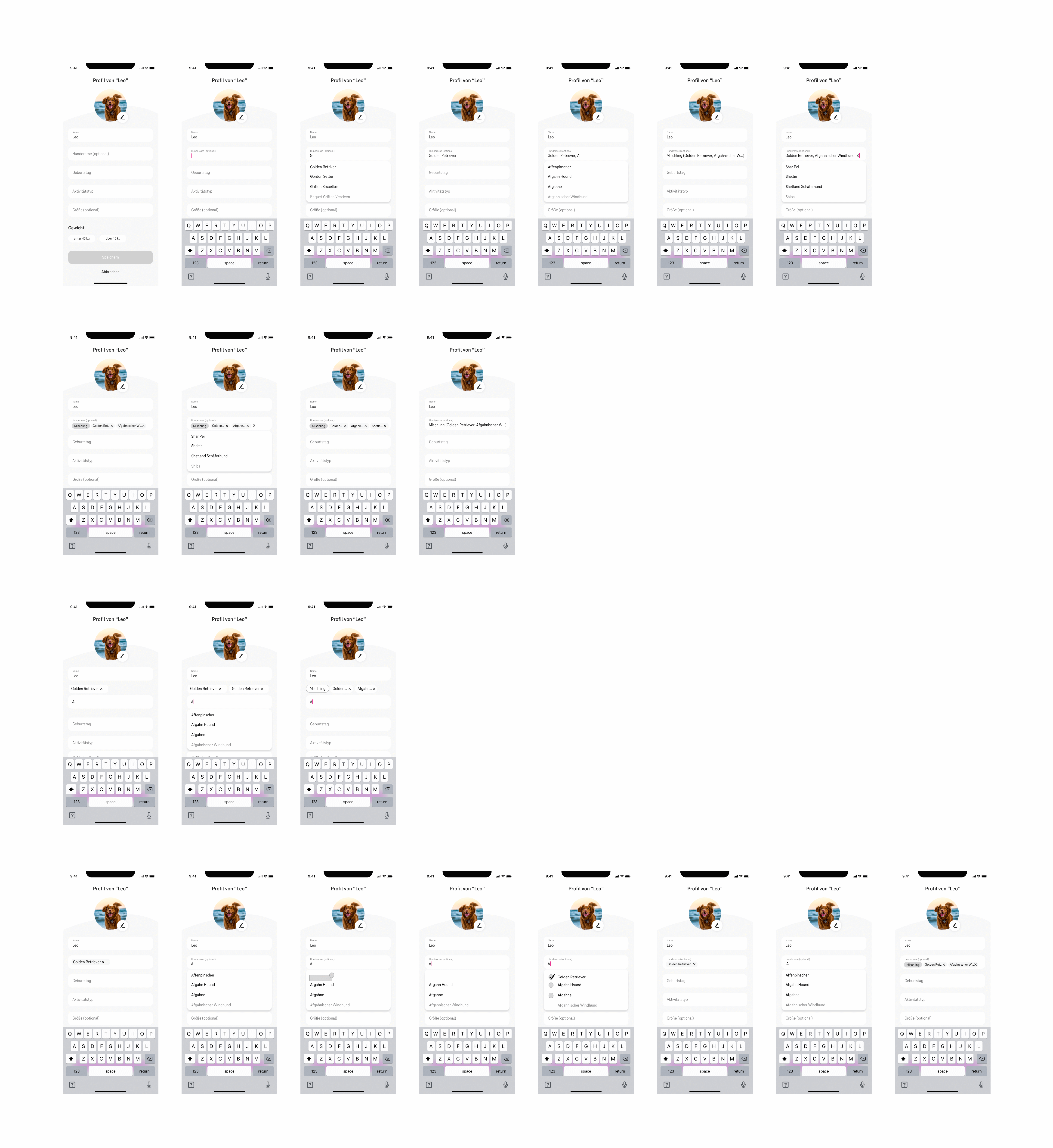Zu allererst ging ich in die Recherche und schaute nach wie Konkurrenz Apps das Problem lösen. Beispiele wie Tractive, felmo und vetevo zeigten deutlich, dass fast immer der gesamte Smartphone Screen genutzt wurde, um das gesamte Interface auf einem Screen abzubilden. Die meisten Apps verwendeten die sogenannten „Chips“ Komponente, um eine aktive Hunderasse darzustellen und wieder zu entfernen. Hierbei handelt es sich um Tags, die sich durch ein Close Icon auch wieder entfernen lassen. Nur wenige Apps verwendeten andere Eingabemethoden, wie z.B. reine Tags oder Option Groups.