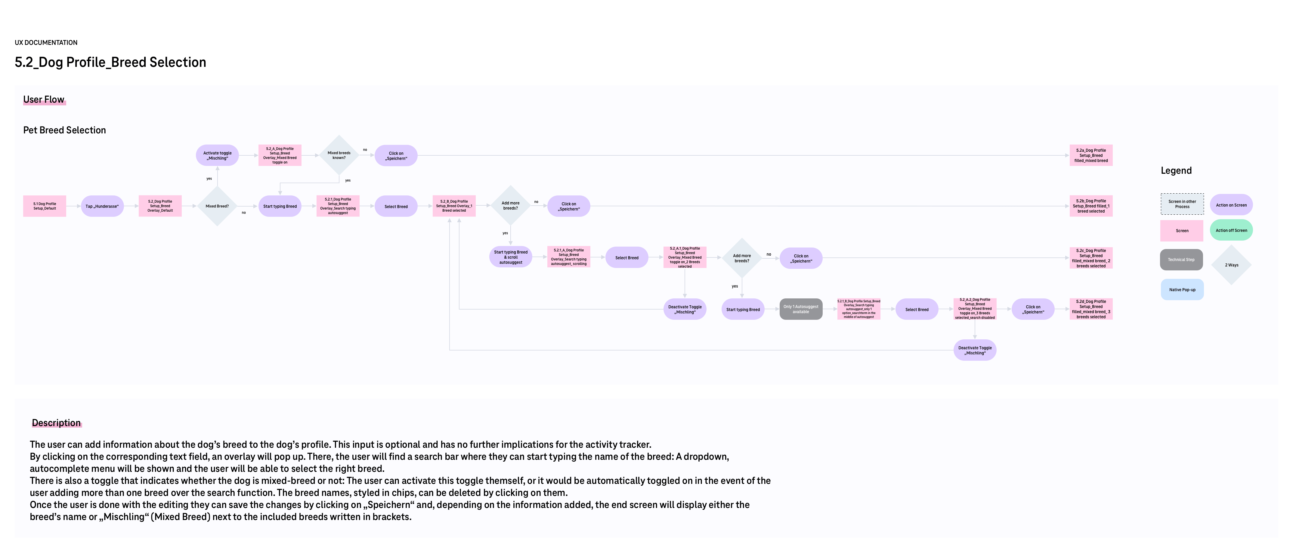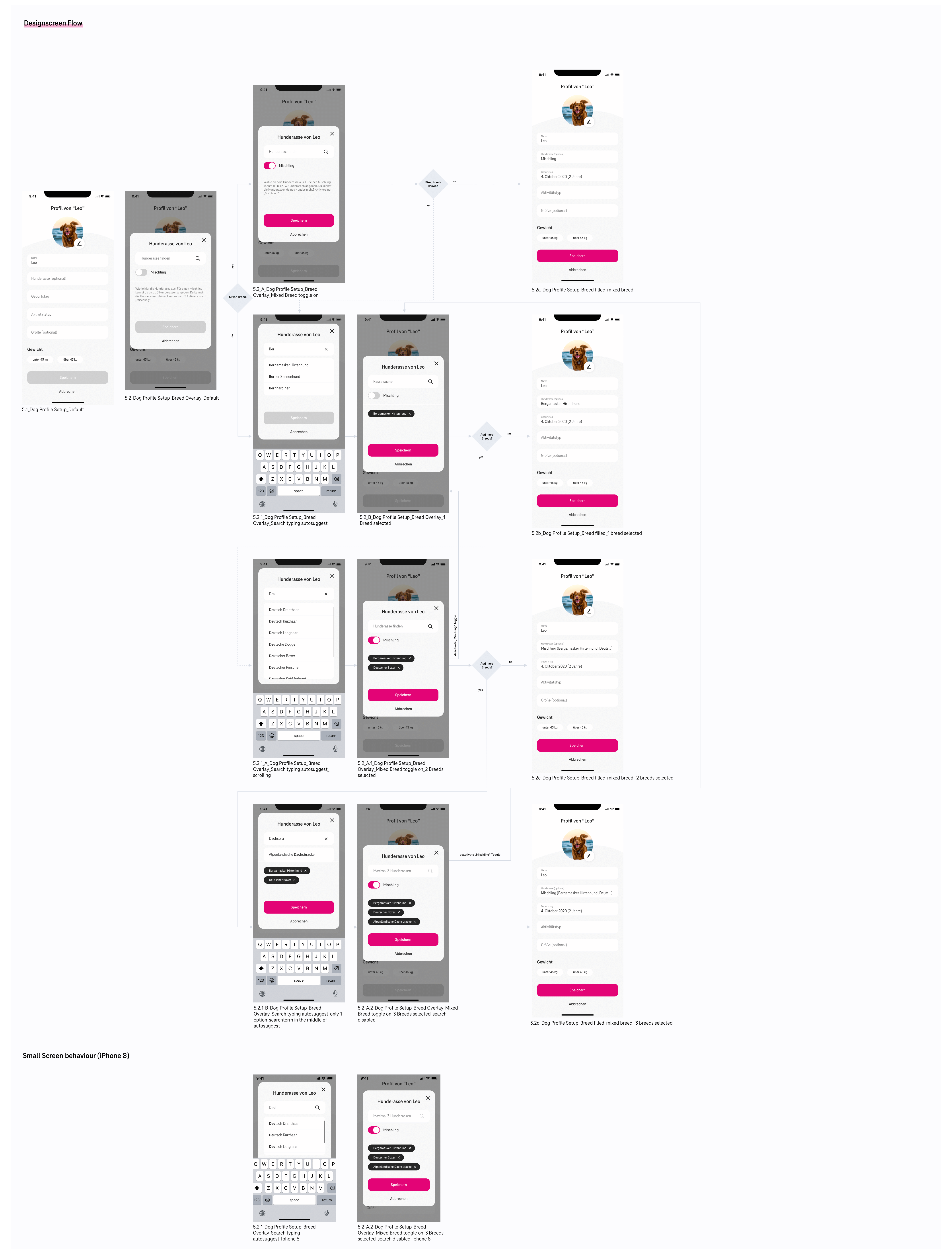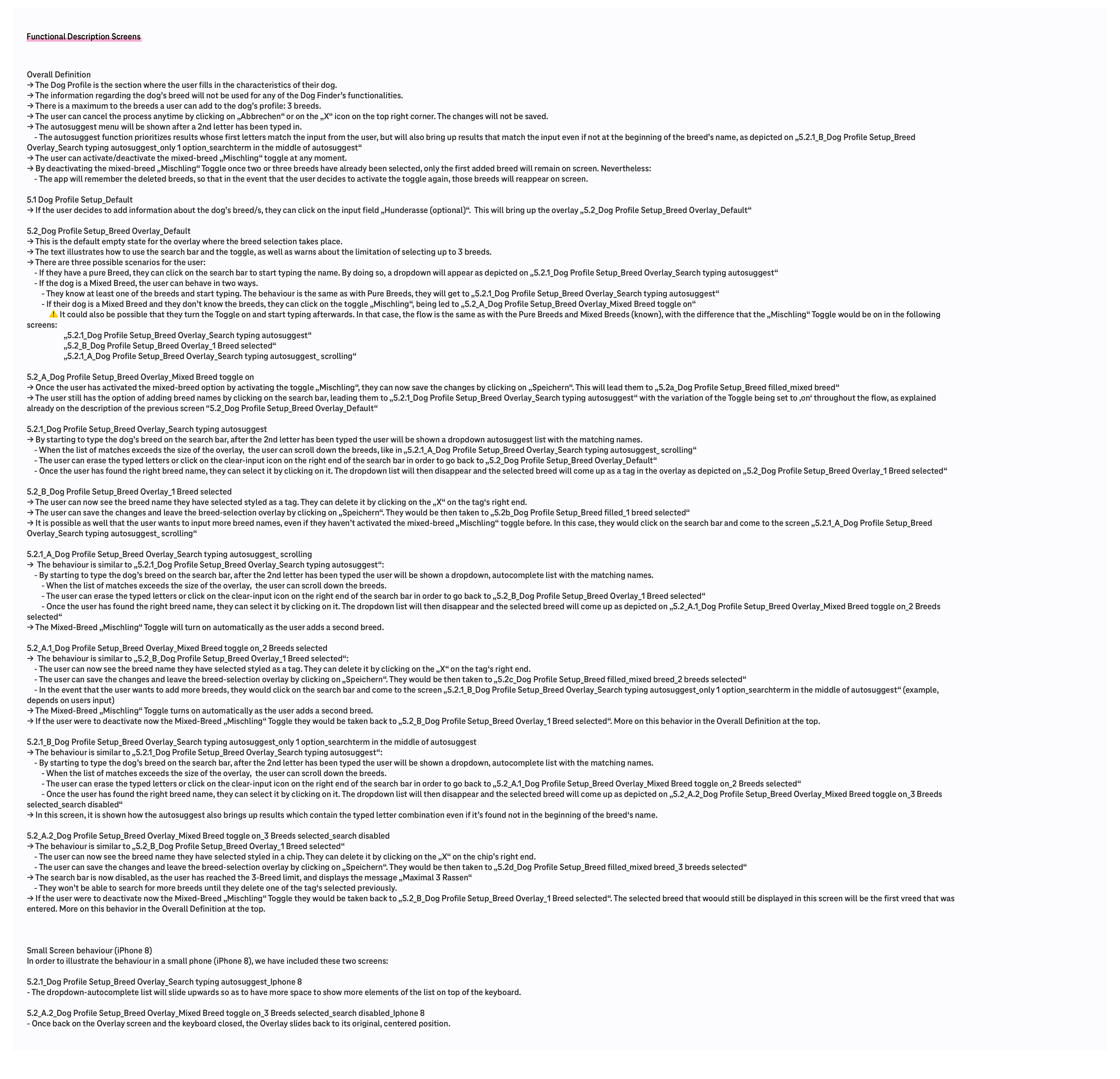 Um das Hunderassenthema den Entwicklern und dem Kunden in seiner gesamten Logik verständlich zu machen, wurde das Ganze noch in der UX Doku festgehalten. Diese besteht aus dem User Flow, der allgemeinen Beschreibung, dem Designscreen Flow und den funktionalen Beschreibungen dieser Screens. Diese Doku enthält alle Feinheiten und Sonderfälle, wie z.B. ab wie vielen Zeichen die Autosuggest Liste angezeigt wird oder dass sich das Search Icon bei aktiver Eingabe