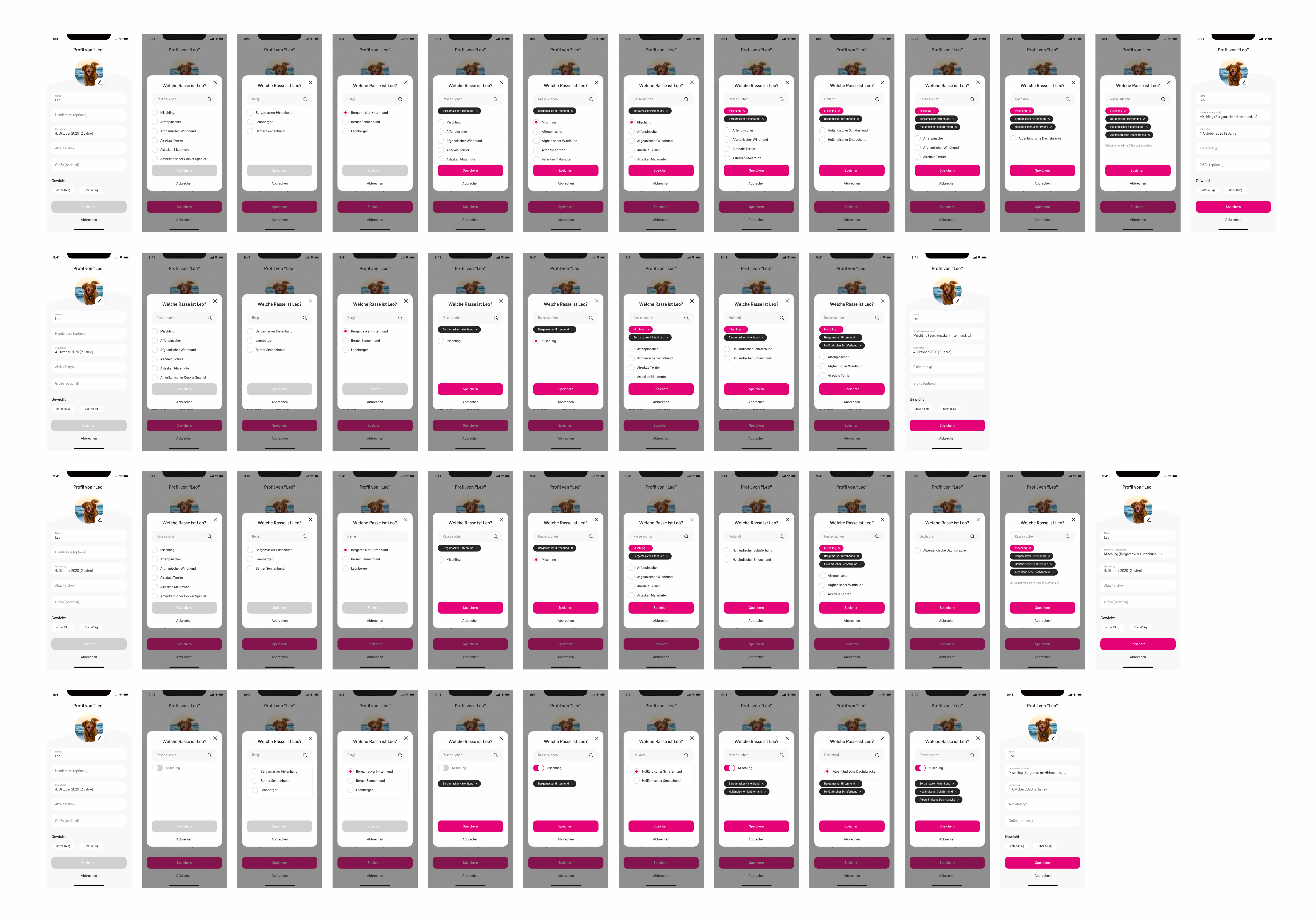 In dieser Phase wurden verschiedene Methoden getestet, um Chips und Option Fields nebeneinander oder getrennt zu kombinieren, um zu sehen ob sich für die Auswahl des Mischlings ein Chip oder ein Toggle besser eignet und um herauszufinden, ob eine immer sichtbare Liste an Hunderassen überhaupt sinvoll ist oder ob eine Autosuggestion / Fuzzy Search hier ausreicht.